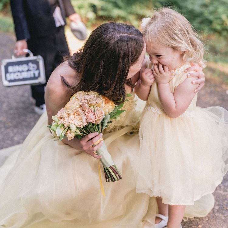 In addition to picking out her dress, you'll also want consider whether there are any accessories you'll want to add to her look—as well as your preferred hairstyle for her. Since she will be preoccupied with tossing petals down the aisle, she likely won't be able to carry any additional florals. However, that doesn't mean that you can't add additional blooms to her outfit. Many brides opt to have this young wedding-party member wear a flower crown that matches their own bouquet—or that of their bridesmaids. Depending on the location of your ceremony, you may have your flower girl walk barefoot down the aisle—or wear a pair of ballet slippers or Mary Janes. Regardless of the shoe option you pick, make sure to account for her growing feet, purchasing them as close to your big day as possible.